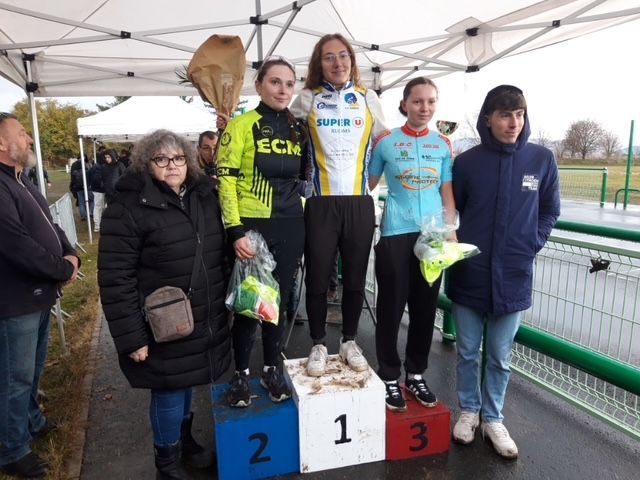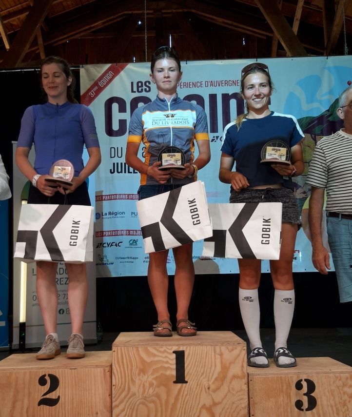 En effet, Marie BRIOTET monte sur la première marche du podium à la cyclo Les Copains sur les 121 kilomètres. Cléa DENEF (16 ans) sur les 87 kms fait une moyenne de 25 KM/H.