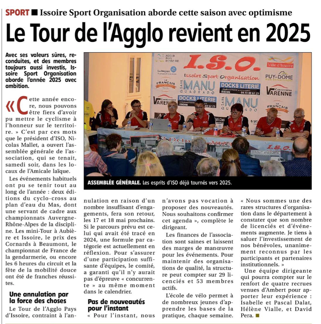 Ce samedi, l’assemblée générale d’Issoire Sport Organisation s’est déroulée dans une salle comble de l'Amicale Laïque d'Issoire en présence d'élus, partenaires, membres actifs, et licenciés. Le bon bilan de la saison passée a été dressé par les différents membres du bureau :
