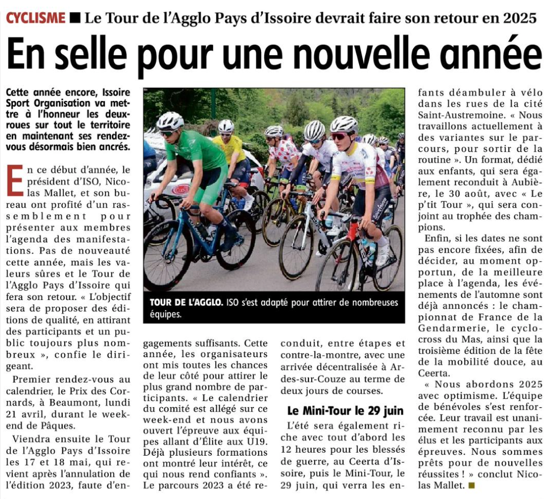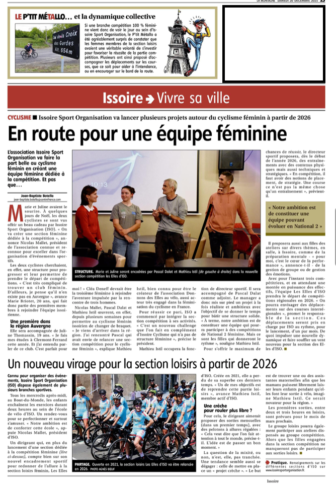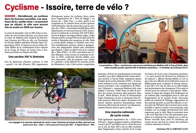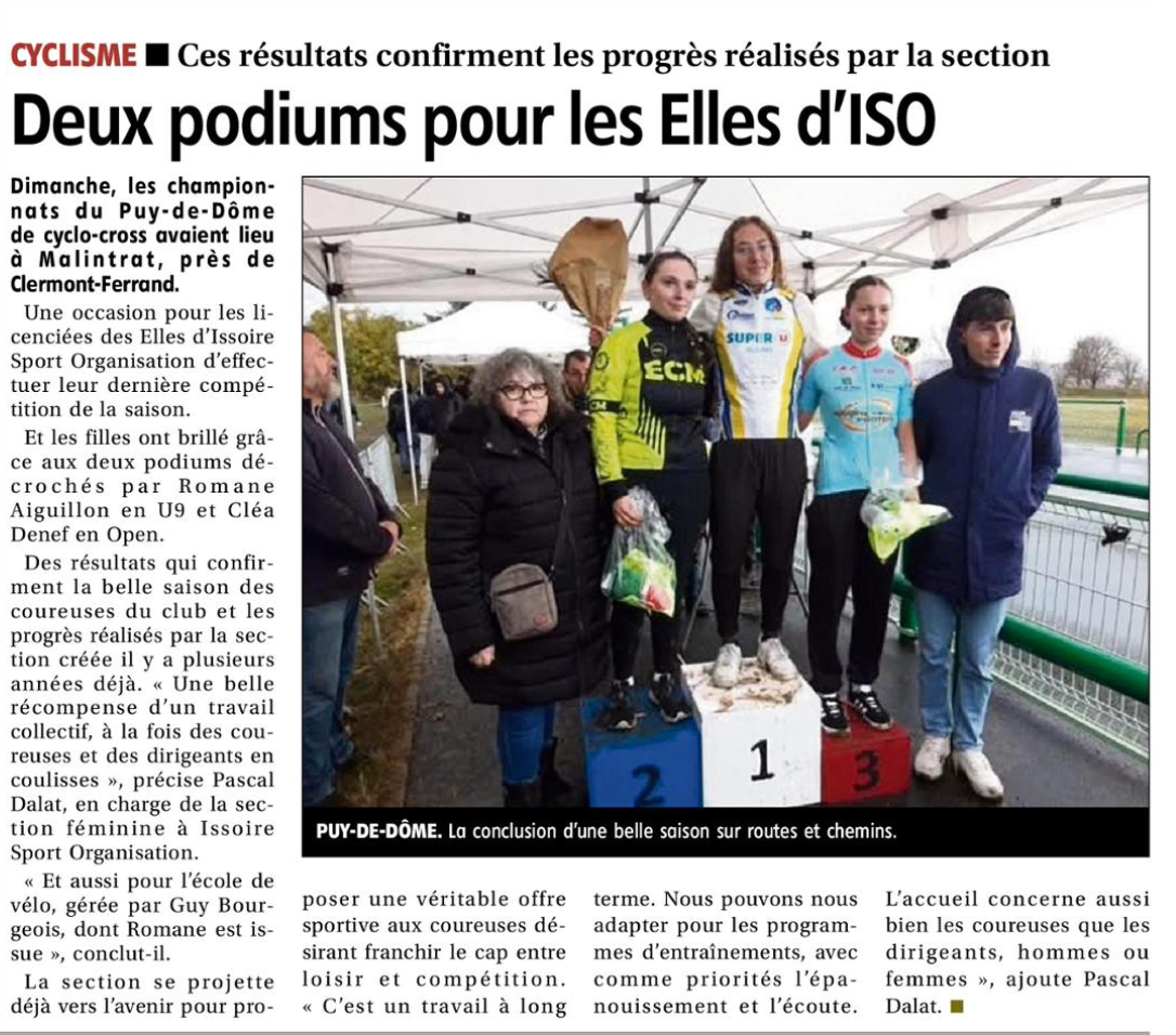 Pour l'ouverture de la saison cycliste sur route à la Vallée du Bédat, le club d'Issoire Sport Organisation avait deux représentantes de sa nouvelle section "les elles d'I.S.O." section compétitions au départ : Cléa DENEF et Marie BRIOTET. Dans un peloton composé de 12 filles, nos féminines sont restées avec le groupe de tête jusqu'à la montée de Châteaugay.