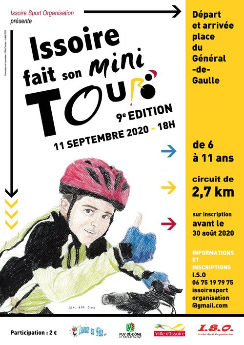 La 9ème édition de la fête enfantine ISSOIRE FAIT SON MINI TOUR se déroulera le vendredi 11 septembre à partir de 18 heures. Un nouveau parcours en vidéo ci-dessous (long de 2700 mètres à parcourir 2 ou 3 fois) sera proposé aux enfants âgés entre 6 & 11 ans. Chaque participant recevra au départ un maillot Jaune (clin d'oeil au Tour de France qui sera dans la région) grâce au soutien des 24 partenaires présents.
