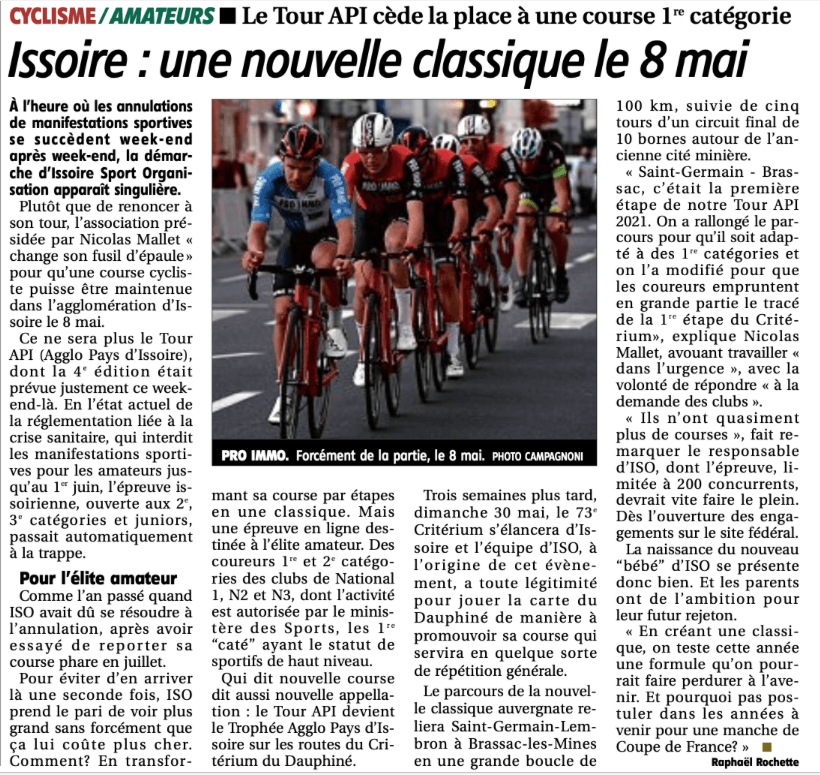Le 1er trophée Agglo Pays d'Issoire "sur les routes du critérium du Dauphiné" sera organisé par Issoire Sport Organisation le samedi 8 mai prochain. Le départ fictif sera donné sur la place du Désert à Saint Germain Lembron.